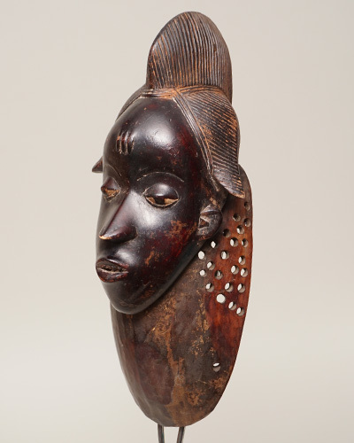 村の祝祭や儀礼で使用され、観る人々を楽しませるとともに、若い花嫁や家庭を悪意から守る霊的な存在としての役割も担う、グロ族の信仰と美意識を映した仮面です。