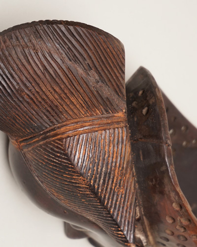 グロ族のグー(Gu)仮面は、髪を大きく盛り上げた優雅な女性像を表現しています。
