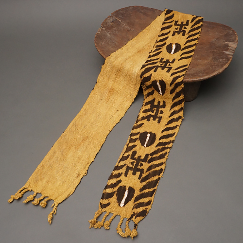 この帯状の布は、まず地元の職人によって綿糸から丁寧に手織りされ、自然の植物染料で下染めされます。
