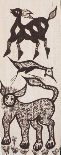 動物は精霊や守護の象徴であり、人の姿は儀式や日常の一場面を表すこともあります。