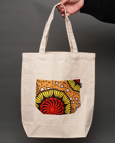 丈夫なキャンバス生地にアフリカンワックスのポケットが付いた可愛いトートバッグです。