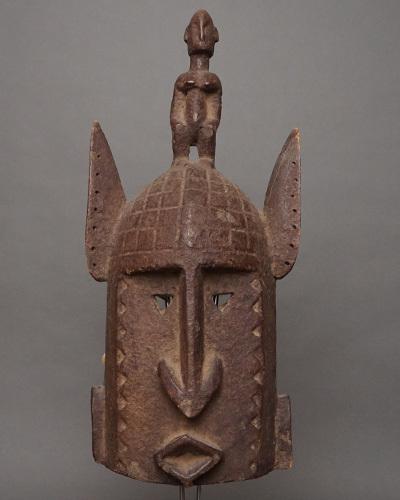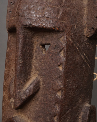 この仮面は、ドゴン族の伝統的な儀礼「ダマ(Dama)」において用いられるもので、祖先の女性たちの霊力と知恵を象徴しています。仮面の頭頂には小さな女性像が彫刻されており、これは「サティ」と呼ばれる神話的な女性たち――ドゴン社会に知識と規律をもたらした存在――を表しています。