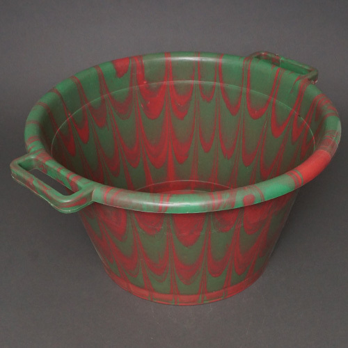 このプラスチック製の両手桶は、西アフリカの家庭や市場で広く使用されている実用的な容器です。耐久性の高いプラスチック素材で作られており、長期間の使用に適しています。両側には持ち手が付いており、水や物を入れた状態でも安定して持ち運ぶことができます。