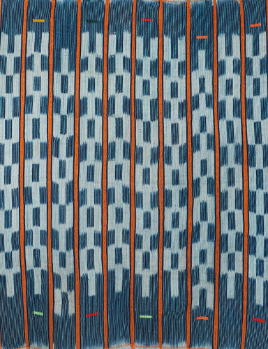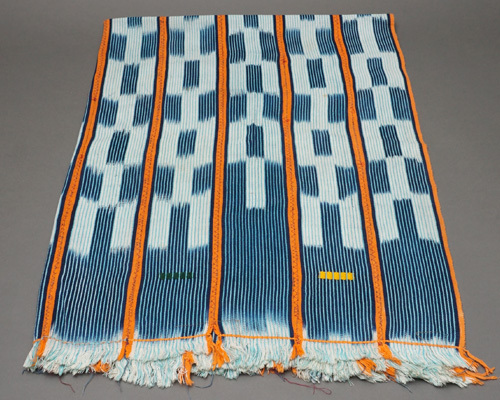 藍染めの糸をベースに、オレンジやピンク、グリーン、イエローなどのカラフルな糸を用いて織り上げられた、美しい色彩とリズム感のある伝統布。