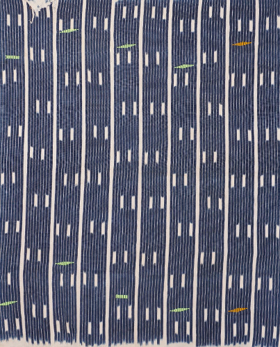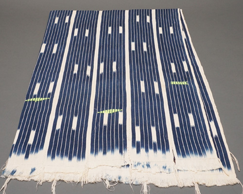藍染めの糸をベースに、オレンジやピンク、グリーン、イエローなどのカラフルな糸を用いて織り上げられた、美しい色彩とリズム感のある伝統布。