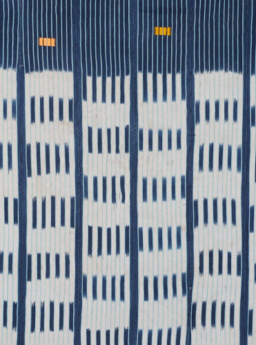 藍染めの糸をベースに、オレンジやピンク、グリーン、イエローなどのカラフルな糸を用いて織り上げられた、美しい色彩とリズム感のある伝統布。