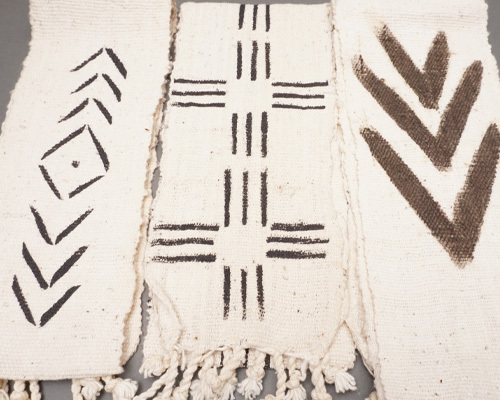 その後、鉄分を含んだ発酵泥を使って模様が描かれ、太陽の力で染料が布に定着していきます。染めと乾燥を何度も繰り返すことで、黒や茶を基調とした深みのある色合いが生まれます。