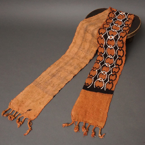 この帯状の布は、まず地元の職人によって綿糸から丁寧に手織りされ、自然の植物染料で下染めされます。