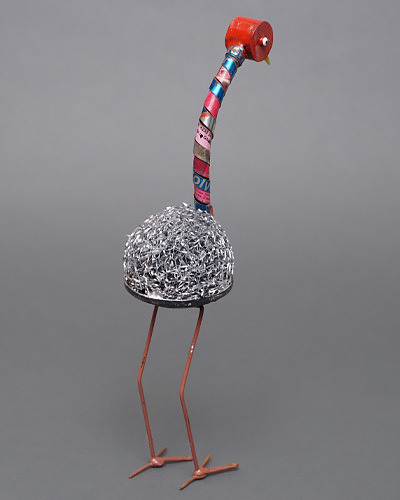 マリ共和国で使用済みの缶や鉄製タワシを再利用し、遊び心ある鳥のフォルムに仕立てたリサイクルアートの置物です。