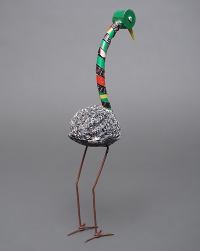 マリ共和国で使用済みの缶や鉄製タワシを再利用し、遊び心ある鳥のフォルムに仕立てたリサイクルアートの置物です。