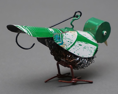 マリ共和国で回収された空き缶を再利用し、手作業で仕上げられた小鳥のブリキオブジェです。
