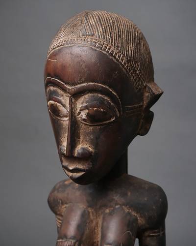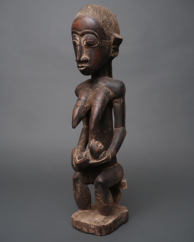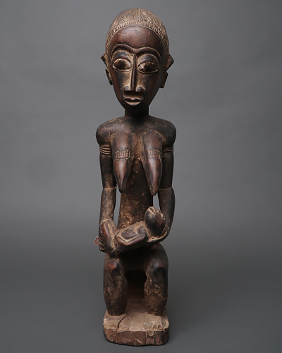 座った姿勢が優雅さと落ち着きを演出し、穏やかな表情や細やかな彫刻が、バウレ族の女性像に込められた文化的意味を伝えます。