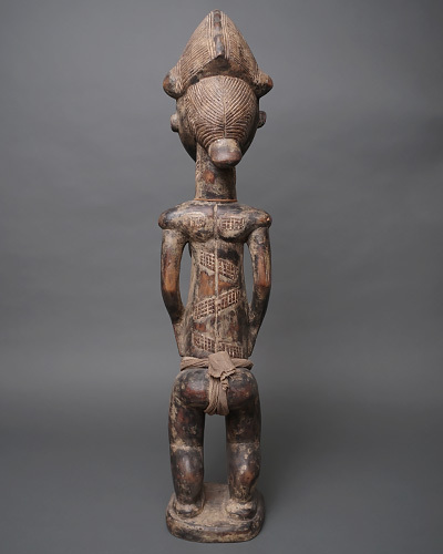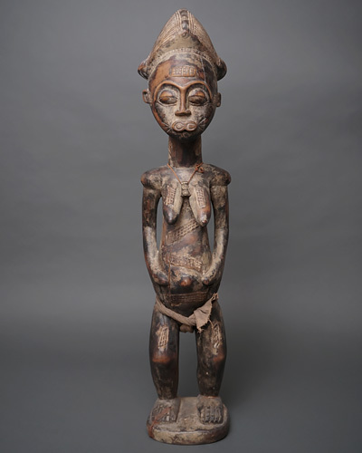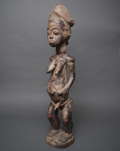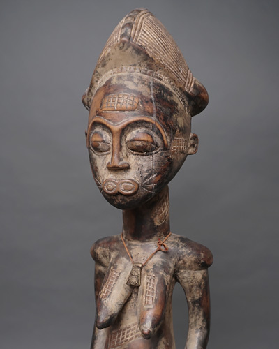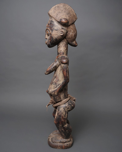頭部にはバウレ族特有の細かく編み込まれた伝統的な髪型が丁寧に彫り出され、女性としての誇りや美意識が余すところなく表現されています。