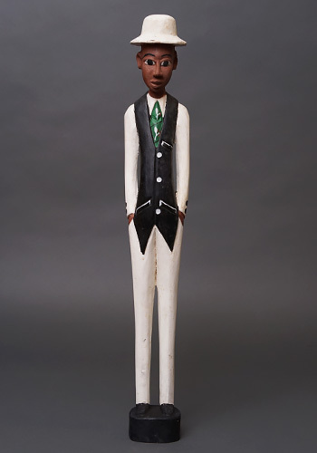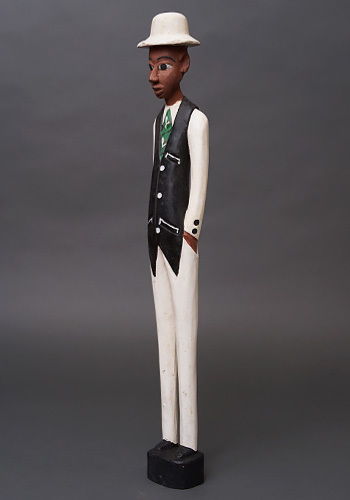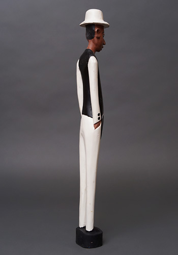 ヨーロッパ人支配者を題材としながらも、肌の色や顔立ちはあえて現地と同じ黒褐色で表され、帽子や洋装、直立した姿勢によって「外から来た権力」という存在そのものを象徴しています。