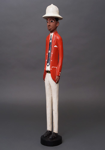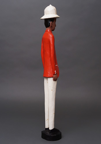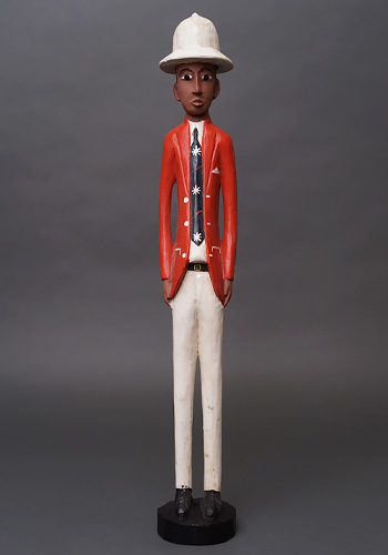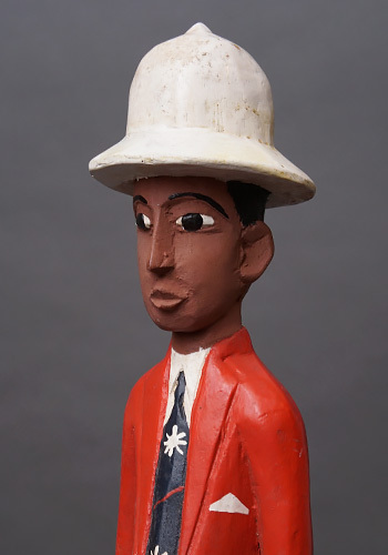 ヨーロッパ人支配者を題材としながらも、肌の色や顔立ちはあえて現地と同じ黒褐色で表され、帽子や洋装、直立した姿勢によって「外から来た権力」という存在そのものを象徴しています。