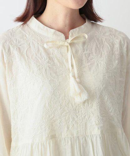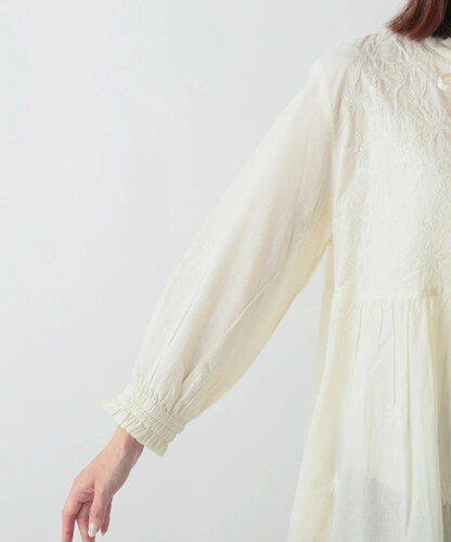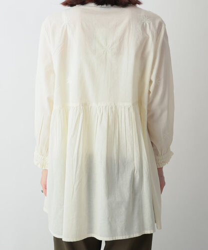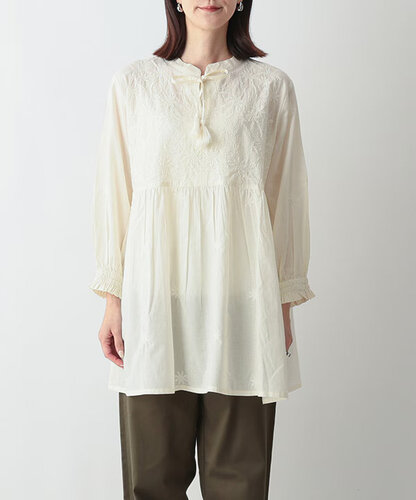 ラクノウ風刺繍コットンチュニックは、ギャザーを入れてふんわりと仕上げた袖と、ヨーク切り替え部分に施した繊細な刺しゅうが魅力。