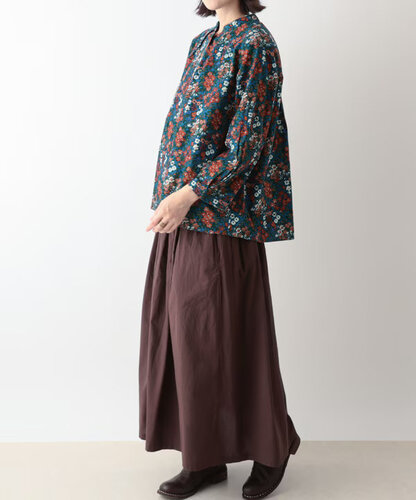 スタンドカラーのブラウスは、襟元と袖口にタックを入れて、ふんわりとした表情を演出。