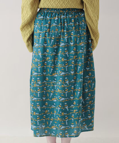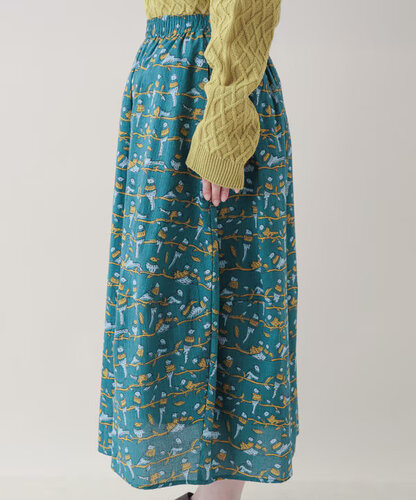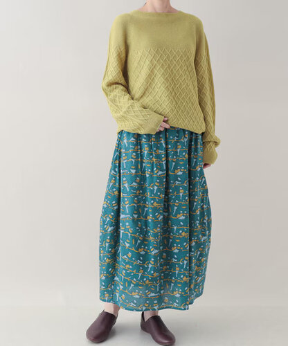 スカートは、ウエスト総ゴムで楽ちん仕様。コクーン気味の丸みのあるシルエットが、プリントのやさしさと好相性です。 トップスをインしてもアウトでもサマになるバランスです。