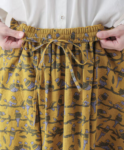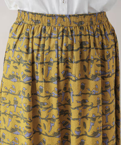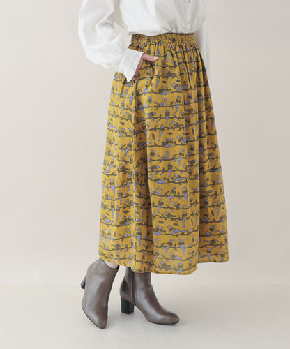 スカートは、ウエスト総ゴムで楽ちん仕様。コクーン気味の丸みのあるシルエットが、プリントのやさしさと好相性です。 トップスをインしてもアウトでもサマになるバランスです。