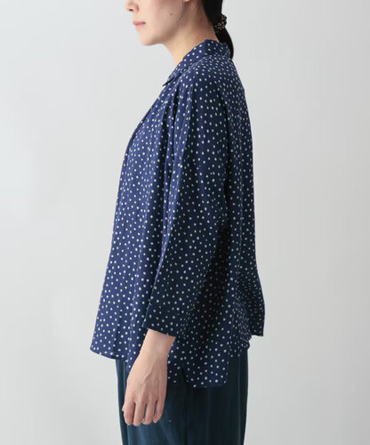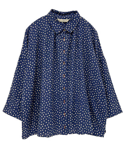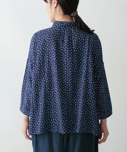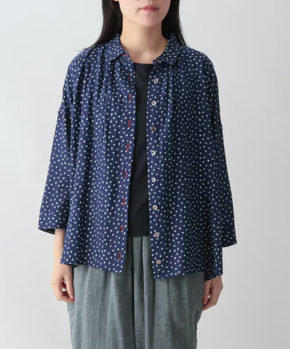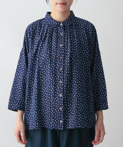 ポルカドット・綿麻レーヨンギャザーブラウス (ネイビー)
