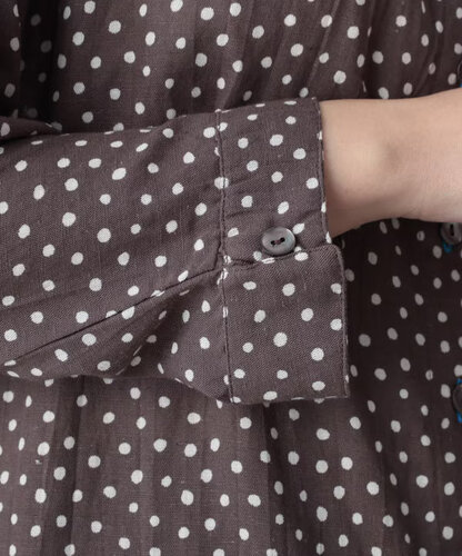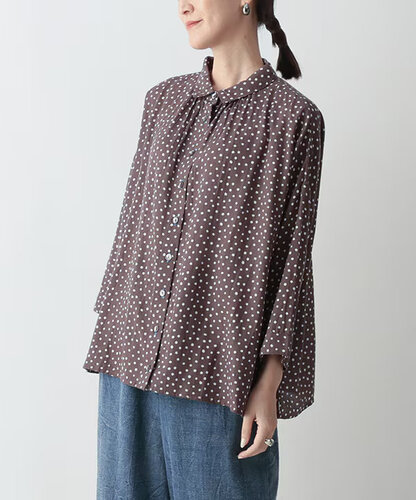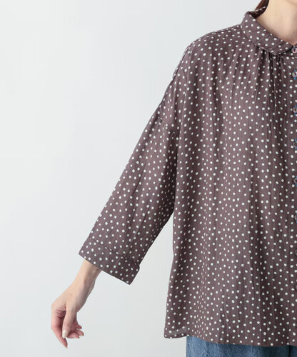 ポルカドット・綿麻レーヨンギャザーブラウス (ブラウン)