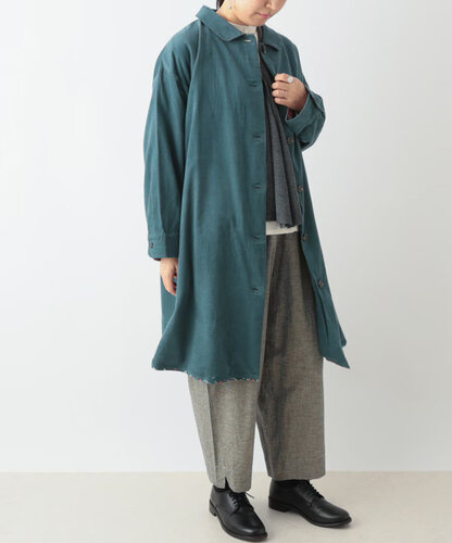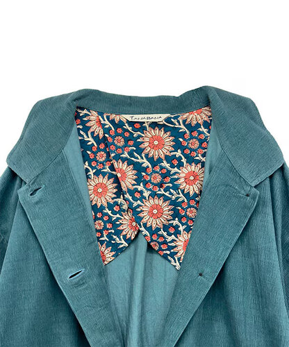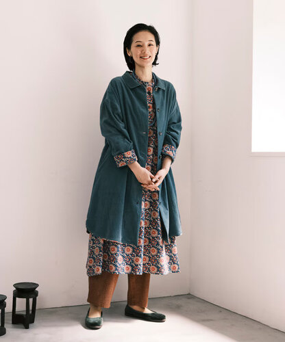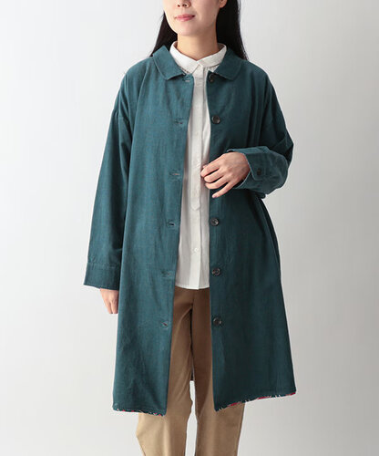 ラフなシルエットのコートは、プリント生地は主張しすぎずポケット袋布や衿裏、裾のパイピングなど、さりげない場所に。