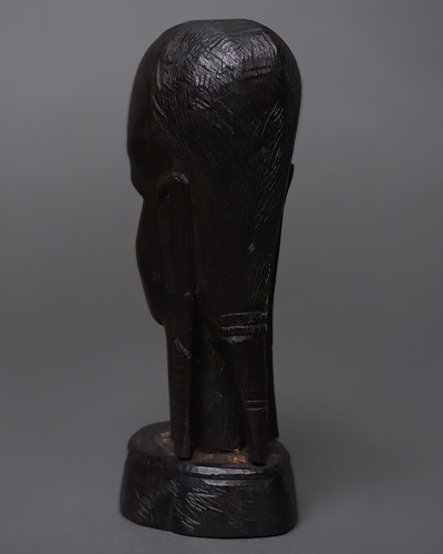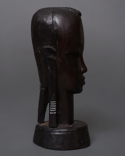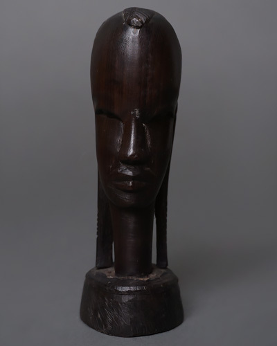 マコンデ彫刻特有の精悍な顔立ちや独特の髪型が、深い漆黒の光沢の中に力強く表現されており、見る角度によって異なる表情を見せるのが魅力です。
