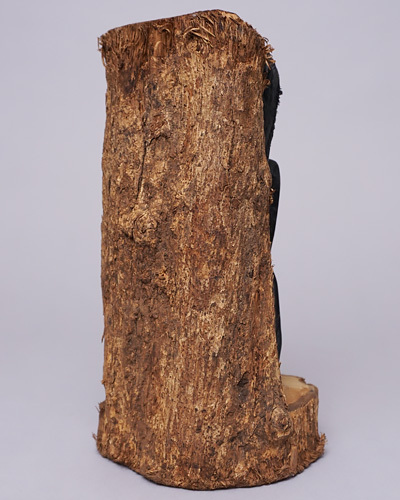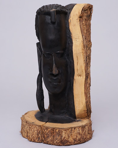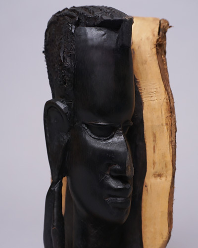 滑らかに磨き上げられた顔の造形と、あえて荒さを残した木肌の対比が、素材の生命力と職人の意図を同時に感じさせる一点物の作品です。