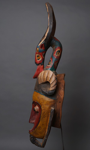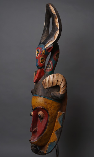 コートジボワールのグロ族による複数の動物の力を宿した神聖な複合マスクです。