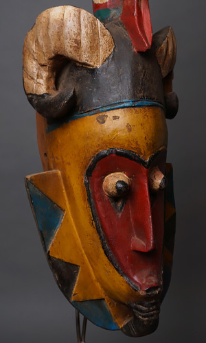グロ族特有の洗練された面立ちに、鮮やかな赤、黄、青、黒の色彩と緻密な幾何学模様が施された彼らの卓越した芸術性と深い精神世界を体現する一級の伝統美術品です。
