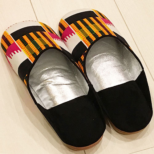 パーニュ布を使って作ったカラフルでかわいいモロッコスタイルのバブーシュです。