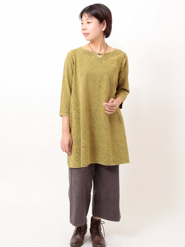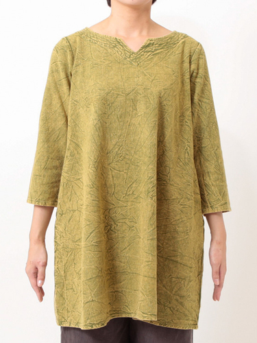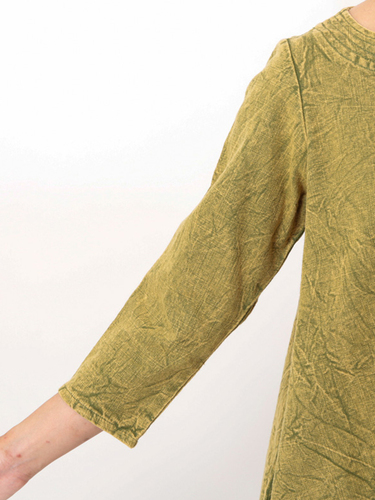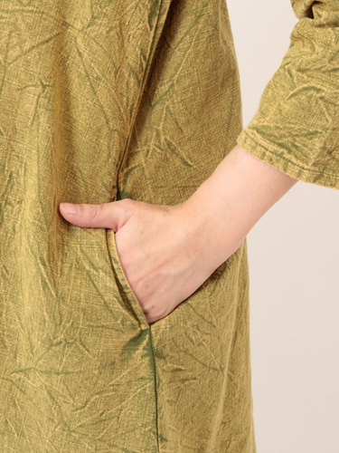 ストーンウォッシュ・クルタ衿チュニック (オリーブ)