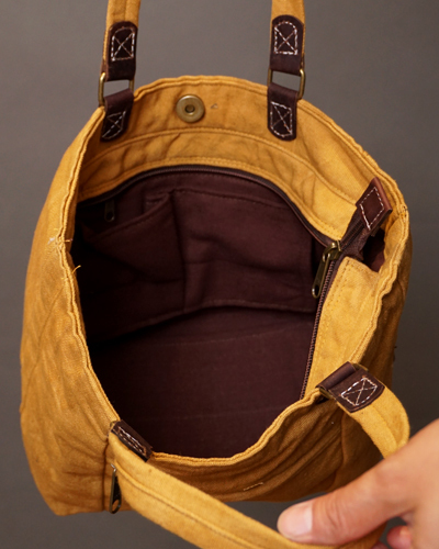 裏地の内部ポケットで非常に使いやすく、プリントではなく染め布で、持ち手のつなぎ部分に牛革を使用しておりますので高級感もありファッショナブルです。