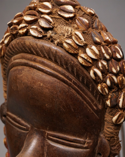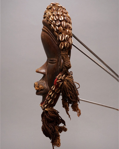 顔の周りに子安貝の装飾、歯は金属で装飾されています。